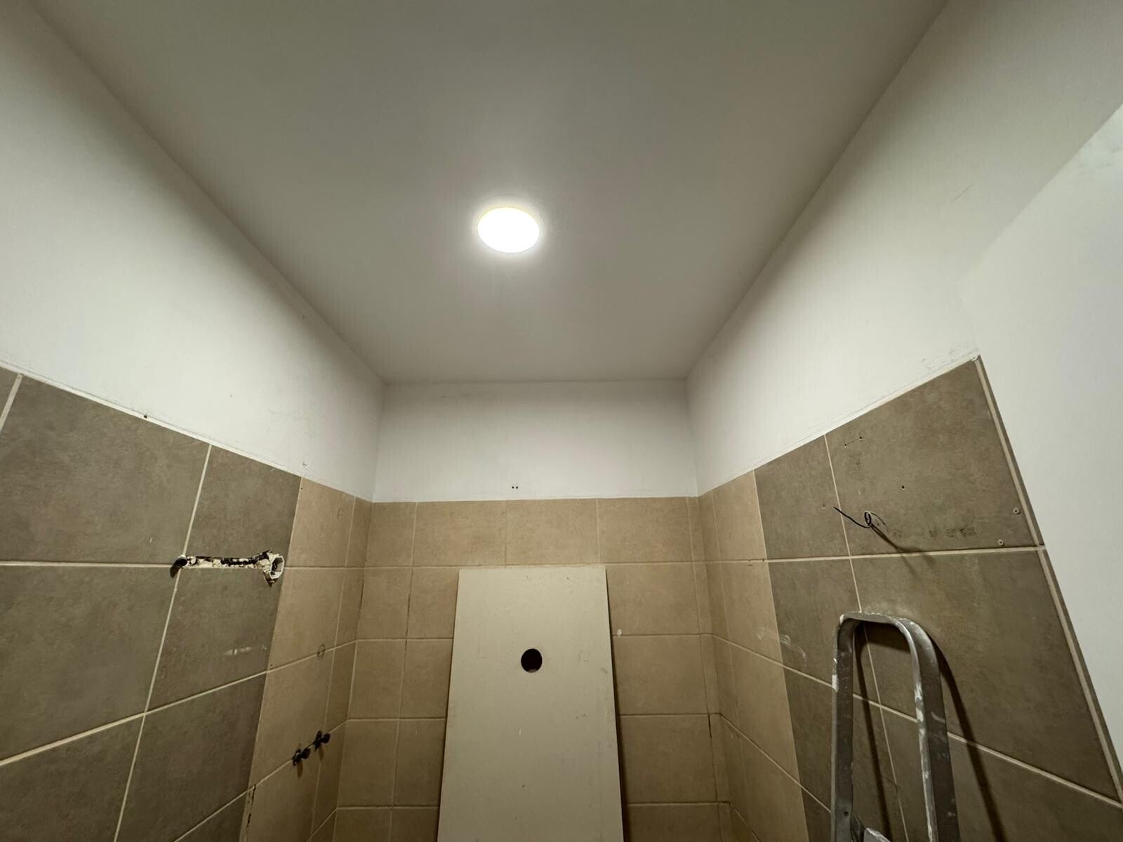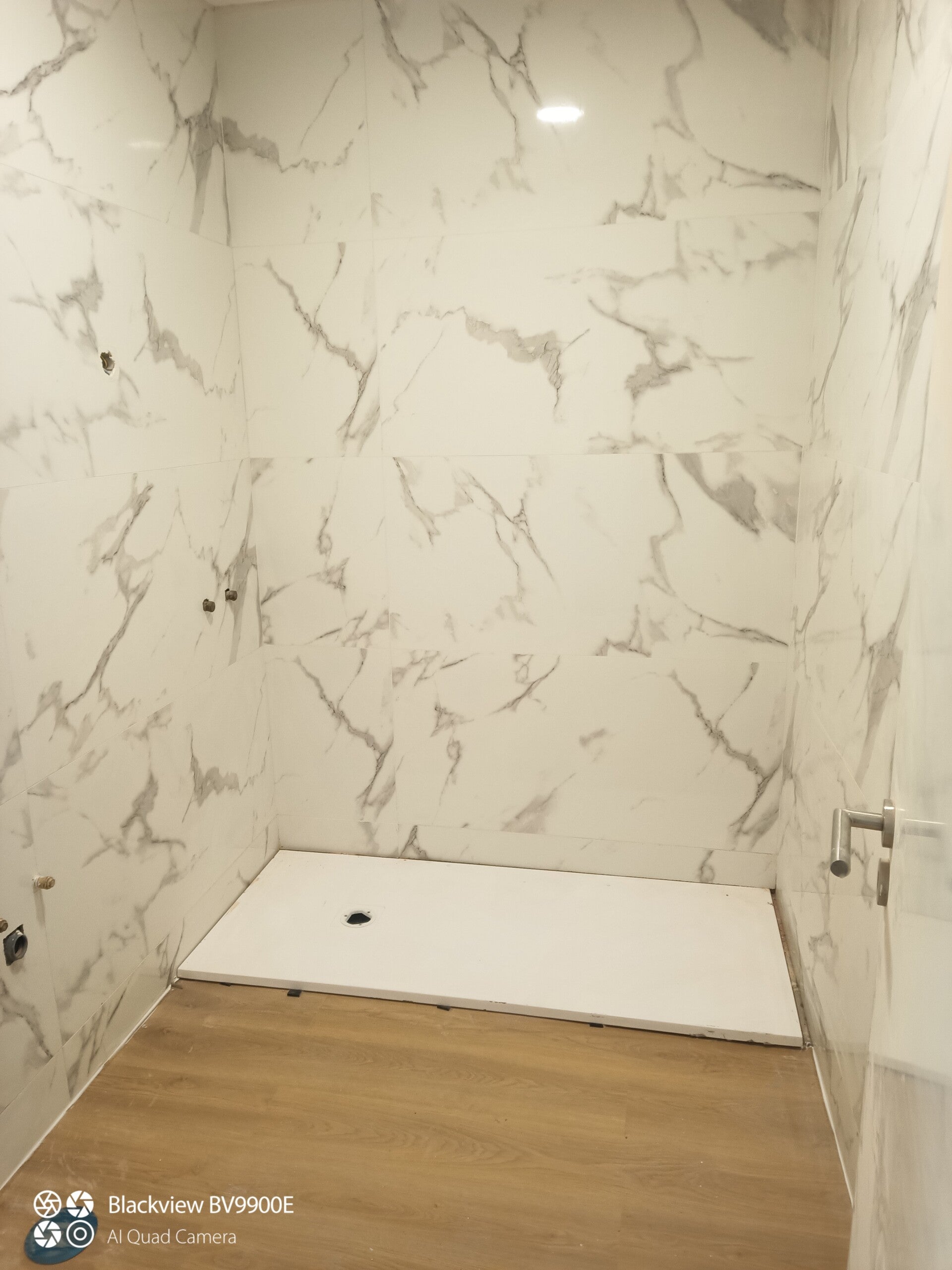 Na casa de banho aplicámos cerâmica 60CM×120CM nas paredes, garantindo um acabamento uniforme, elegante e com poucas juntas visíveis, o que melhora não só a estética como a higiene do espaço. Este tipo de cerâmica, de grande formato, exige precisão no nivelamento e corte, garantindo um resultado final perfeito.