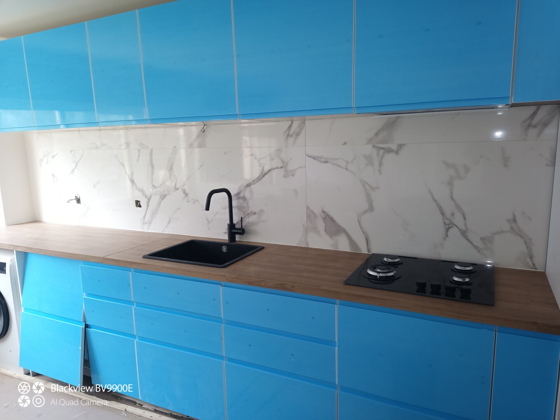 Na cozinha, instalámos o mesmo formato cerâmico por cima da bancada, criando uma zona resistente à água, ao calor e às manchas, ao mesmo tempo que conferimos um visual contínuo e sofisticado. O trabalho incluiu preparação das superfícies, correção de irregularidades e aplicação cuidadosa para assegurar aderência e durabilidade.